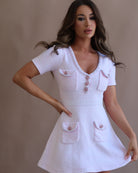 استمتعي بأناقة ومتعة فستان داليا الوردي القصير بتصميمه الأنثوي الجذاب على شكل حرف A. يُضفي خط العنق الكلاسيكي على شكل حرف V والأزرار الأمامية اللامعة لمسة من الرقي، بينما يُضفي القماش المزخرف والأكمام القصيرة لمسةً من الأناقة والعملية. مع جيوب أمامية عملية مزينة بأزرار، يُمكنكِ إضافة لمسة مميزة إلى هذا التصميم الجميل.